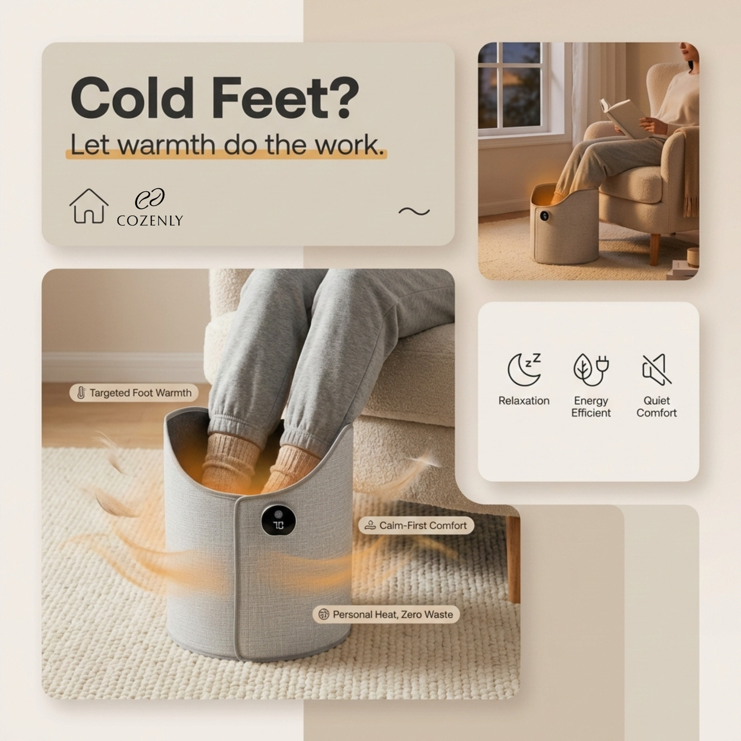 Conzenly gently wraps your feet and lower legs in soothing warmth, helping your body relax, stay focused, and feel at ease — whether you’re working or unwinding at home.
